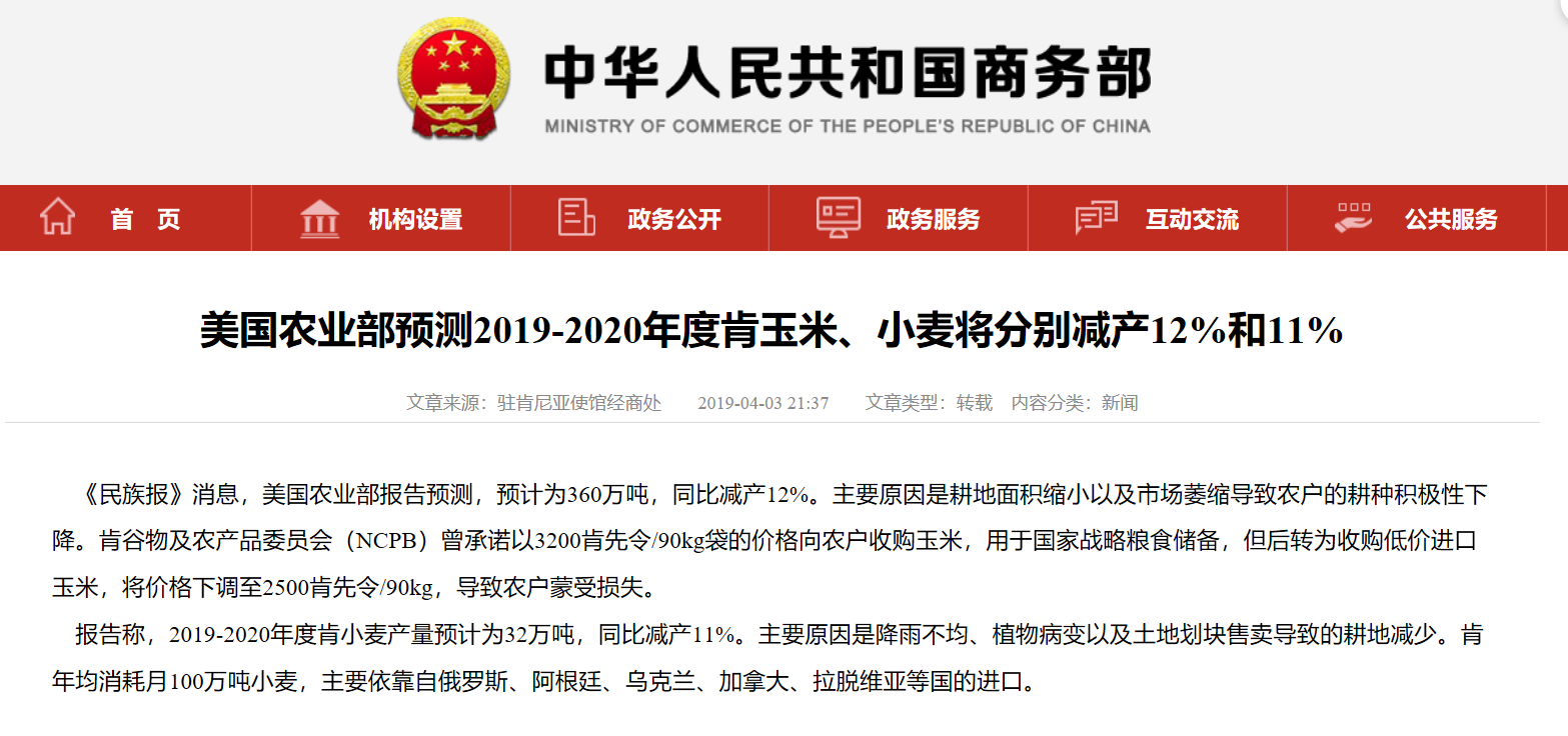 报告称,2019-2020年度肯小麦产量预计为32万吨,同比减产11%。主要原因是降雨不均、植物病变以及土地划块售卖导致的耕地减少。肯年均消耗月100万吨小麦,主要依靠自俄罗斯、阿根廷、乌克兰、加拿大、拉脱维亚等国的进口。