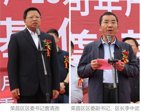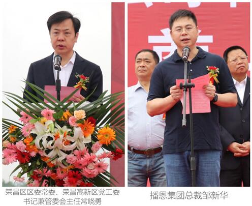荣昌区区委书记曹清尧、区委副书记兼区长李中武、区人大主任艾亚军、区政协主席陈震等领导莅临现场。播恩集团总裁邹新华、副总裁肖九明、副总裁曹剑波、集团董事会秘书周乔及行业合作伙伴共同出席奠基仪式。仪式由荣昌区区委常委、荣昌高新区党工委书记兼管委会主任常晓勇主持。