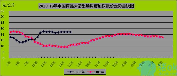 生猪价格方面,猪易大数据市场研究部的初统数据显示,2019年第21周出栏商品大猪均价环比持平,其中出栏外三元大猪周度均价14.92元/公斤,环比持平,同比上涨41.56%;出栏内三元大猪周度均价14.55元/公斤,环比持平,同比上涨43.07%;出栏土杂大猪周度均价14.17元/公斤,环比持平,同比上涨44.74%;外三元、内三元及土杂猪周度加权均价14.81元/公斤,环比持平,同比上涨41.99%;仔猪周度均价38.21元/公斤,环比上涨0.13%,同比上涨62.46%。