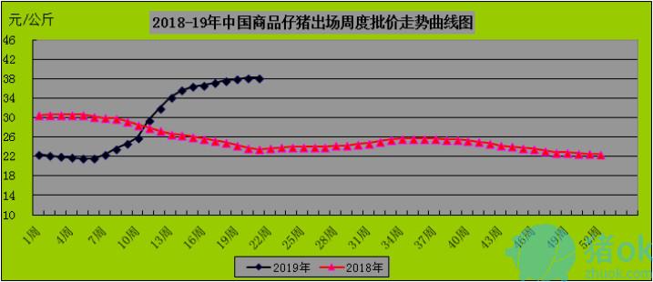 图表一,2018-19年中国生猪/仔猪周度加权均价比较曲线图(单位元公斤):