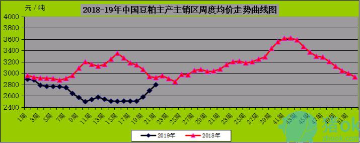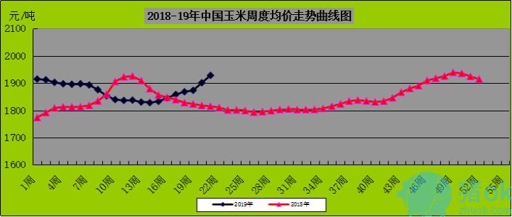图表二,2018-19年中国玉米/豆粕周度均价走势曲线图(单位元公斤):