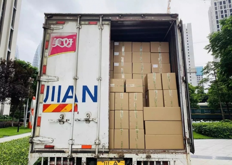 新希望六和食品控股同事清晨驱车载送部分食品物资赶往宜宾,并与宜宾当地经销商联系,就近调配美好自热米饭等方便食品。