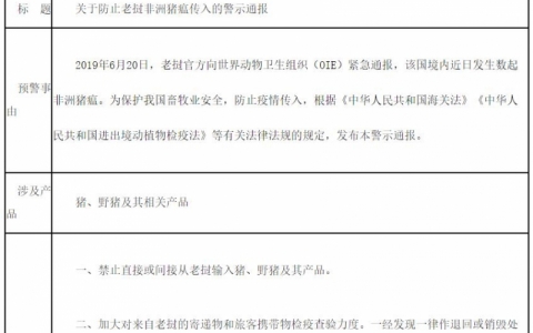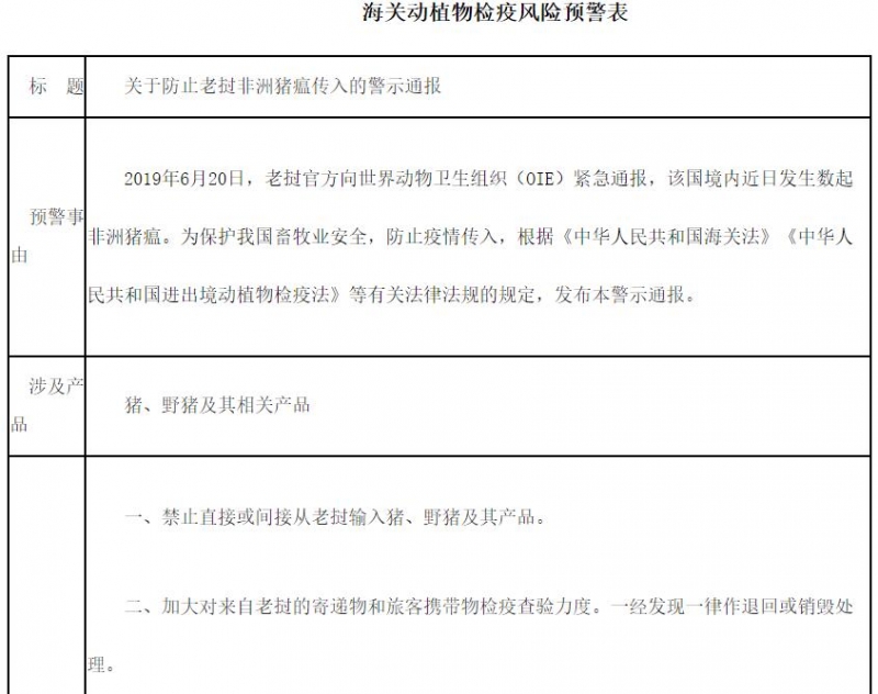 6月20日,老挝官方向世界动物卫生组织(OIE)紧急通报,该国境内近日发生数起非洲猪瘟。据统计,亚洲地区发生非洲猪瘟疫的国家增至6个,分别是中国、越南、柬埔寨、朝鲜、蒙古和老挝。同时,海关总署发出警告,为了防止非洲猪瘟疫情的交叉感染,禁止直接或间接从老挝输入猪或者野猪及其制品。