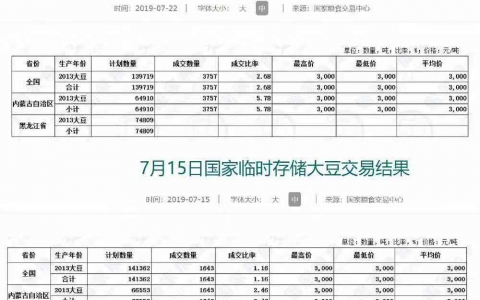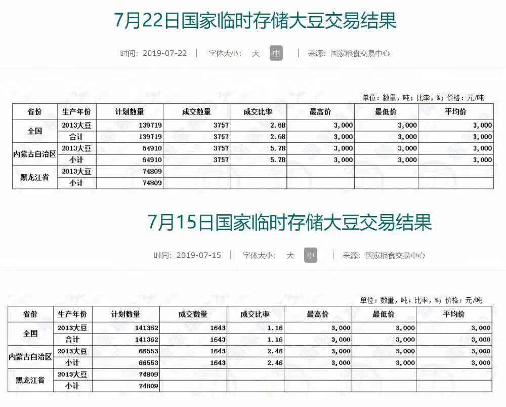 7月22日,国家临时存储大豆第六次拍卖,大豆成交率只有2.68%,成交价3000元/吨。其中,内蒙古计划拍卖64910吨,实际成交量为3757吨,成交率为5.78%;黑龙江省计划拍卖74809吨大豆,实际成交量为0。