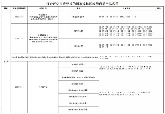 新增意大利9家猪肉企业自2019年8月20日及以后生产的符合中国要求的冷冻猪肉产品输华。