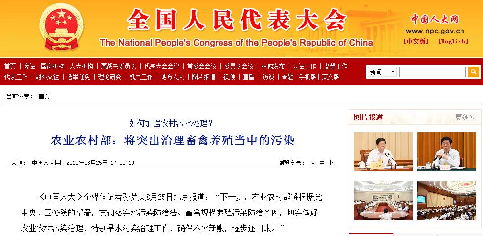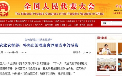 《中国人大》全媒体记者孙梦爽8月25日北京报道:“下一步,农业农村部将根据党中央、国务院的部署,贯彻落实水污染防治法、畜禽规模养殖污染防治条例,切实做好农业农村污染治理,特别是水污染治理工作,确保不欠新账,逐步还旧账。”
