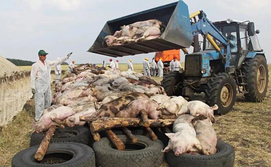 2010年8月26日,俄罗斯罗斯托夫地区,工人将患有非洲猪瘟的病猪屠宰后堆在一起准备焚烧 (来源:视觉中国)
