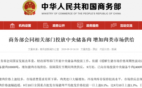9月19日,商务部会同国家发展改革委、财政部等部门开展中央储备肉投放工作。依据《缓解生猪市场价格周期性波动调控预案》,共向市场投放中央储备猪肉10000吨,增加猪肉市场供给,保障国庆节期间肉类供应。 9月初,已向市场投放中央储备牛肉2400吨,羊肉1900吨。