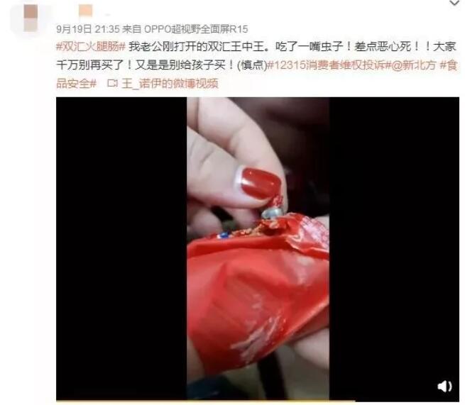 摘要:近日,沈阳一消费者发布微博称其丈夫在吃双汇火腿肠时吃到活虫子。微博内容:“我老公刚打开的双汇王中王,吃了一嘴的虫子!差点恶心死!大家千万别再买了!尤其是给孩子买!”
