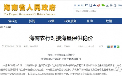 据海南日报报道,为贯彻落实省委省政府关于稳定生猪生产和市场保供稳价的要求,农行海南省分行积极对接省内生猪养殖重点龙头企业,与海垦控股集团密切合作,为其旗下的海垦畜牧集团在临高县建设的10万头仔猪场项目开辟融资绿色通道,高效完成5000万元项目贷款的审批和投放,并于9月30日实现首笔500万元的放款。