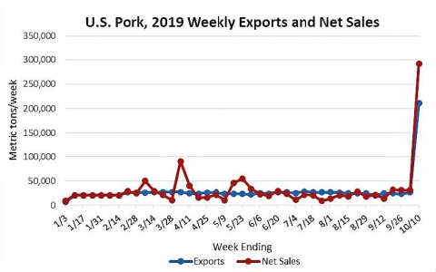 美国上周猪肉出口销售飙升,共被购买了35.1万吨猪肉。其中15.26万吨来自中国,而前一周为14.22万吨。