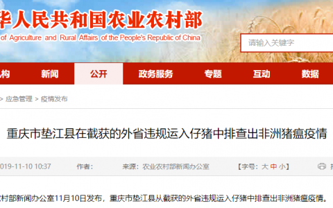 农业农村部新闻办公室11月10日发布,重庆市垫江县从截获的外省违规运入仔猪中排查出非洲猪瘟疫情。