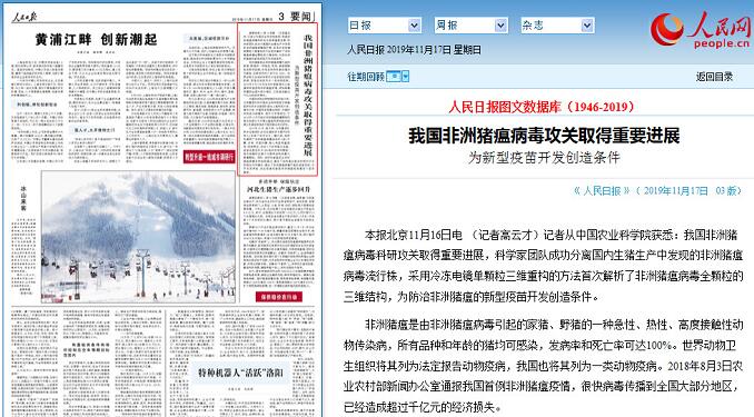 记者从中国农业科学院获悉:我国非洲猪瘟病毒科研攻关取得重要进展,科学家团队成功分离国内生猪生产中发现的非洲猪瘟病毒流行株,采用冷冻电镜单颗粒三维重构的方法首次解析了非洲猪瘟病毒全颗粒的三维结构,为防治非洲猪瘟的新型疫苗开发创造条件。
