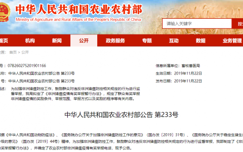 根据《中华人民共和国动物防疫法》、《国务院办公厅关于加强非洲猪瘟防控工作的意见》(国办发〔2019〕31号)、《国务院办公厅关于稳定生猪生产促进转型升级的意见》(国办发〔2019〕44号)精神,为加强非洲猪瘟防控工作,鼓励群众对违反非洲猪瘟防控相关规定的行为进行监督举报,我部制定了《非洲猪瘟疫情有奖举报暂行办法》,并确定了农业农村部非洲猪瘟疫情有奖举报电话,现予公告。