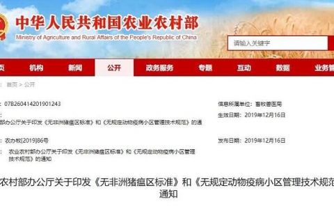 农业农村部办公厅关于印发《无非洲猪瘟区标准》和《无规定动物疫病小区管理技术规范》的通知