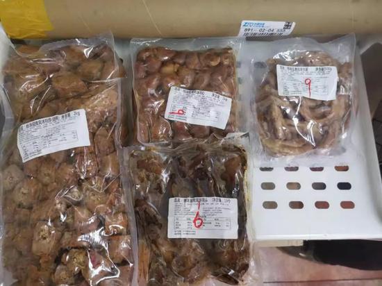 记者跟随执法人员在该店加工区的冷藏箱内发现了多袋密封包装好的卤肉制品。从塑料袋上张贴的标签可以看出,分别为净含量为2公斤的“绝味招牌风味鸭脖微辣”、净含量1公斤装的“绝味招牌风味鸭心”、净含量为500克的“绝味五香风味鸭掌”,以及净含量为10个的“绝味黑鸭风味鸭头。