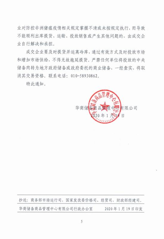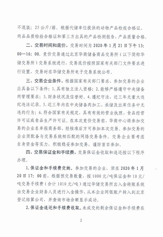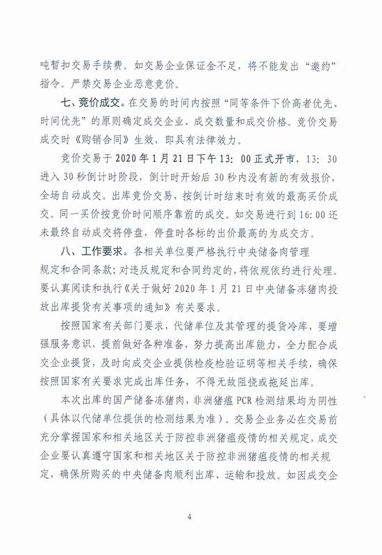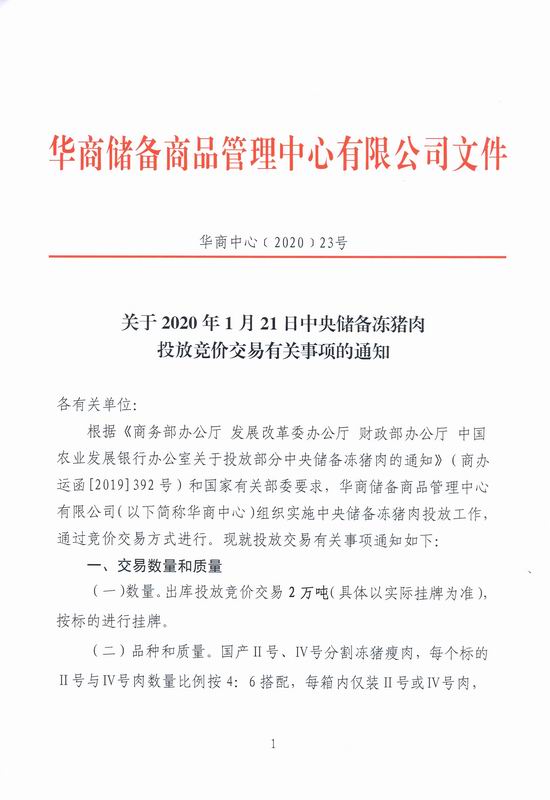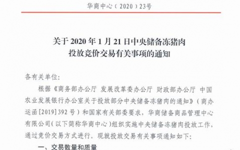 关于2020年1月21日中央储备冻猪肉投放竞价交易有关事项的通知