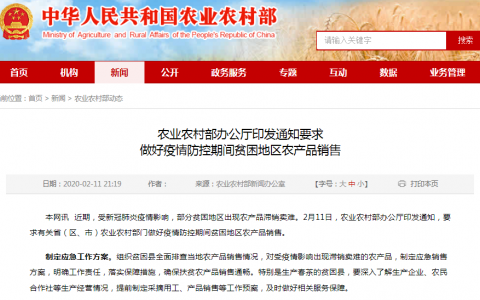 农业农村部2月11日讯,近期,受新冠肺炎疫情影响,部分贫困地区出现农产品滞销卖难。2月11日,农业农村部办公厅印发通知,要求有关省(区、市)农业农村部门做好疫情防控期间贫困地区农产品销售。