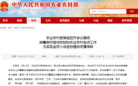 2月13日,农业农村部党组书记、部长韩长赋主持召开部党组会议,传达学习习近平总书记在中央政治局常委会会议上的重要讲话精神和国务院常务会议精神,分析新冠肺炎疫情对农业农村工作的影响,研究部署下一步工作措施。会议强调,要深入学习领会习近平总书记重要讲话精神和党中央、国务院决策部署,深刻认识做好疫情防控工作的极端重要性,时刻牢记职责使命,把中央对“三农”工作各方面要求落实到位,坚持防控疫情和推动经济社会发展“两手抓”“两手硬”“两不误”,积极配合农村疫情防控,统筹抓好今年“三农”重点工作,为实现全面小康目标提供支撑保障。