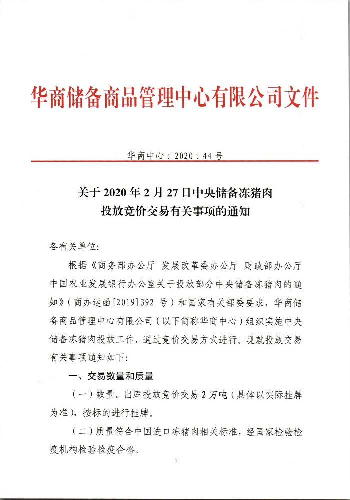 华储网25日发布中央储备冻猪肉投放竞价交易有关事项的通知,将竞价交易2万吨,交易时间为2020年2月27日下午13时至16时,这是今年以来第8批投放的中央储备冻猪肉,累计投放量将达17万吨。