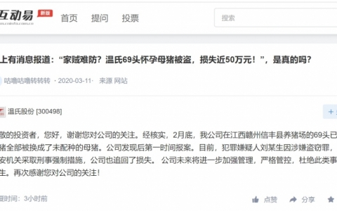 近日,有投资者在互动易平台提问,网上有消息报道:“家贼难防?温氏69头怀孕母猪被盗,损失近50万元!”,是真的吗?