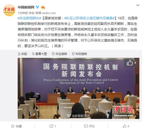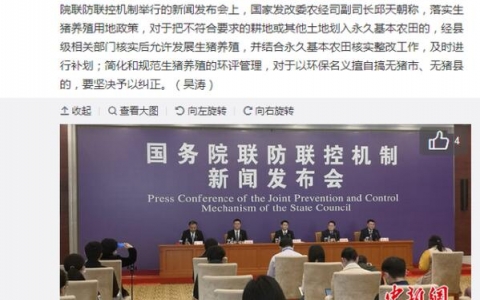 3月19日,在国务院联防联控机制举行的新闻发布会上,国家发改委农经司副司长邱天朝称,落实生猪养殖用地政策,对于把不符合要求的耕地或其他土地划入永久基本农田的,经县级相关部门核实后允许发展生猪养殖,并结合永久基本农田核实整改工作,及时进行补划;简化和规范生猪养殖的环评管理,对于以环保名义擅自搞无猪市、无猪县的,要坚决予以纠正。