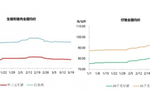 分化的生猪市场2020年前三个月,生猪市场继续高位运行,但不同生猪产品的价格走势出现了明显分化。生猪和猪肉价格高位震荡,仔猪和母猪价格则持续上涨。其中,外三元生猪全国均价从年初的35元/公斤上涨至2月下旬的38元/公斤,之后又稳中回落,截止3月中旬为36元/公斤,相比年初上涨了3%左右。白条猪肉价格走势大体相同。