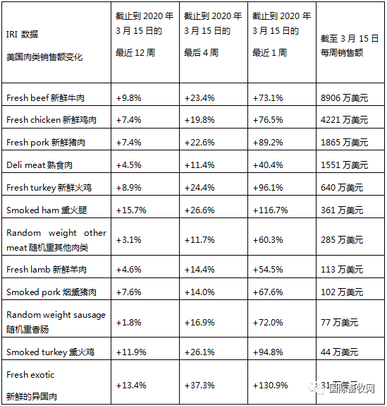 据数据分析公司IRI的报告显示,3月15日当周的5大肉类销售销售额全部上升。排在前面的是牛腰肉、碎火鸡肉、即食牛肉和鸡翅。其中,碎牛肉 99.7%,碎火鸡肉, +87.3%,碎鸡肉n, +88.3%,碎猪肉k, +69.9%,碎羊羔肉, +53.2%。