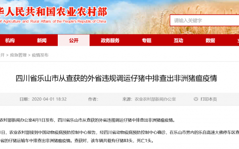 农业农村部新闻办公室4月1日发布,四川省乐山市从查获的外省违规调运仔猪中排查出非洲猪瘟疫情。