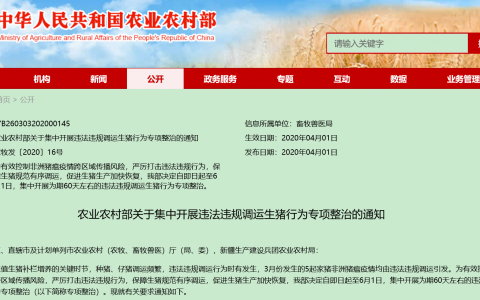 当前,正值生猪补栏增养的关键时节,种猪、仔猪调运频繁,违法违规调运行为时有发生,3月份发生的5起家猪非洲猪瘟疫情均由违法违规调运引发。为有效控制非洲猪瘟疫情跨区域传播风险,严厉打击违法违规行为,保障生猪规范有序调运,促进生猪生产加快恢复,我部决定自即日起至6月1日,集中开展为期60天左右的违法违规调运生猪行为专项整治(以下简称专项整治)。现就有关要求通知如下。