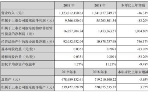 2019年,公司全年实现营业收入1,123,012,450.63元,比上年同期减少16.31%,利润总额17,252,197.77元,净利润15,340,254.81元,归属于母公司所有者净利润9,366,630.01元。