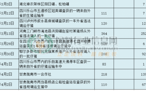 4月2日,农业农村部接到中国动物疫病预防控制中心报告,经甘肃省动物疫病预防控制中心确诊,陇南市一合作社发生非洲猪瘟疫情。3月初,该合作社曾从外省违规调入仔猪112头,疫情确诊时,该批仔猪死亡67头,加上原存栏的106头生猪中死亡72头,共死亡生猪139头。同日,经甘肃省动物疫病预防控制中心确诊,陇南市两当县杨店公路检查站在查获的外省违规调运生猪中排查出一起非洲猪瘟疫情。查获时,该车共载有仔猪110头,死亡4头,隔离期间剩余仔猪陆续死亡63头,共死亡仔猪67头。