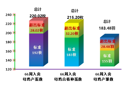 4、累积产蛋220.02只,超过手册标准(192只)14.59个百分点;每只入舍母鸡累积产合格种蛋215.20只,超过手册标准(183)17.59个百分点;每只入舍母鸡累积提供雏鸡183.48只,超过手册标准(155只)18.37个百分点。见图4。