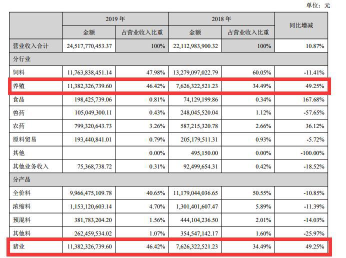 2019年饲料销量405.81万吨,同比下降15.38%。其中,猪料销量211.05万吨,同比下降28.08%;禽料销量171.5万吨,同比增长9.43%。