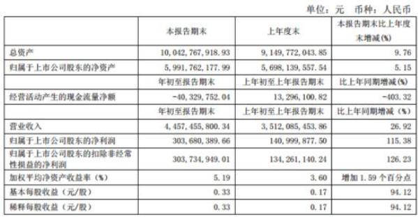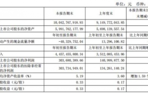 第一季度经营活动产生的现金流量净额为-40,329,752.04元,上年同期13,296,100.82元;基本每股收益为0.33元/股。