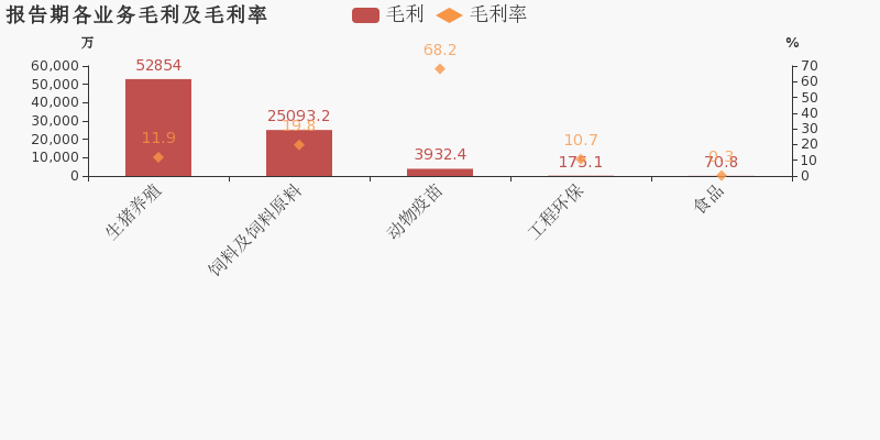 从业务结构来看,“生猪养殖”是企业营业收入的主要来源。具体而言,“生猪养殖”营业收入为44.4亿,营收占比为74%,毛利率为11.9%。