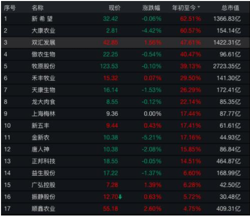 疫情之下,猪肉产业相关板块表现较好,Wind数据显示,今年以来猪产业指数涨幅超过15.55%,其中新希望、大康农业年初至今涨幅超60%,另外,双汇发展、傲农生物、牧原股份等均表现亮眼。