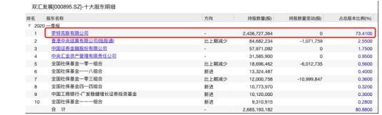 截至2020年第一季度末,罗特克斯为双汇发展的第一大股东,持股比例达到73.41%。