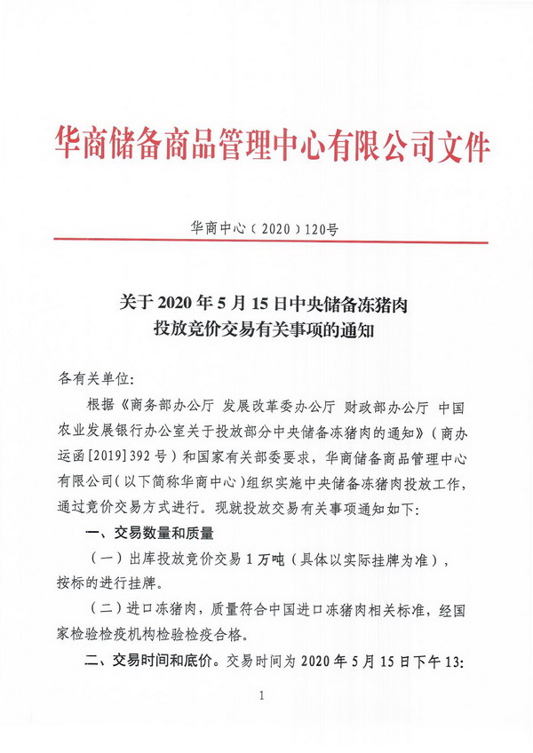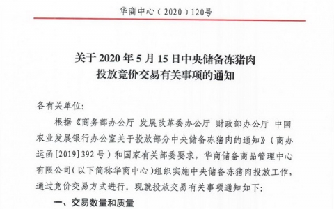 华储网5月12日发布中央储备冻猪肉投放竞价交易有关事项的通知,将竞价交易1万吨,交易时间为2020年5月15日下午13时至16时,这是今年以来第18批投放的中央储备冻猪肉,累计投放量将达34万吨。