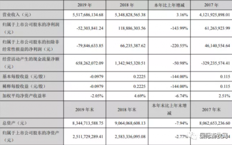2019年实现营业收入551,768.61万元,同比增长3.16%;净利润-3,434.45万元,同比下降117.91%;归属于母公司净利润-5,230.38万元,同比下降143.99%;归属于上市公司股东的扣除非经常性损益的净利润-7,984.66万元,同比下降220.55%。