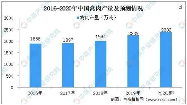 从禽肉产量情况来看:禽肉是我国城乡居民蛋白质消费的主要来源。目前,禽肉已取代牛肉成为世界上第二大消费肉类,由于禽肉价格低于其他肉类,消费者普遍认为禽肉是一种安全肉类,禽肉消费快速增长。据国家统计局数据显示:2019年,我国禽肉产量2239万吨,增加245万吨,增长12.3%。随着百姓肉品消费结构的升级,禽肉消费量还将进一步增加。到2020年,我国禽肉产量或近2400万吨。
