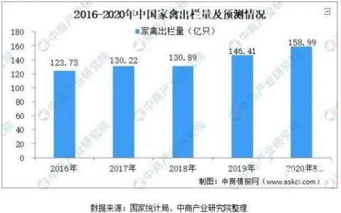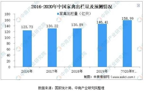 据国家统计局数据显示:2019年全国家禽出栏146.41亿只,比2018年增加15.51亿只,增长11.9%;全国家禽存栏65.22亿只,同比增加4.85亿只,增长8.0%。据预测,2020年我国家禽出栏将近160亿只。