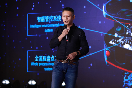 图为:小龙潜行产品负责人刘正旭开启小龙潜行生猪智能养殖新品发布
