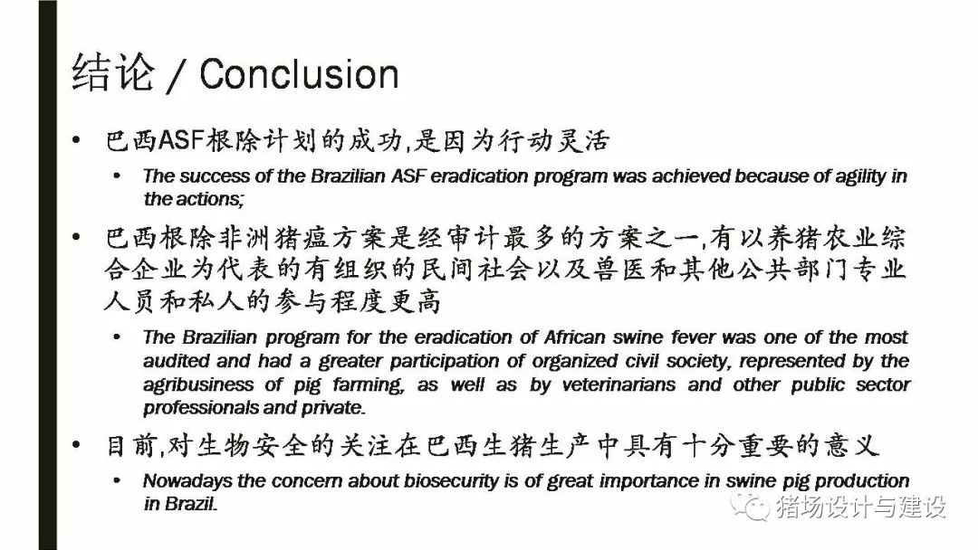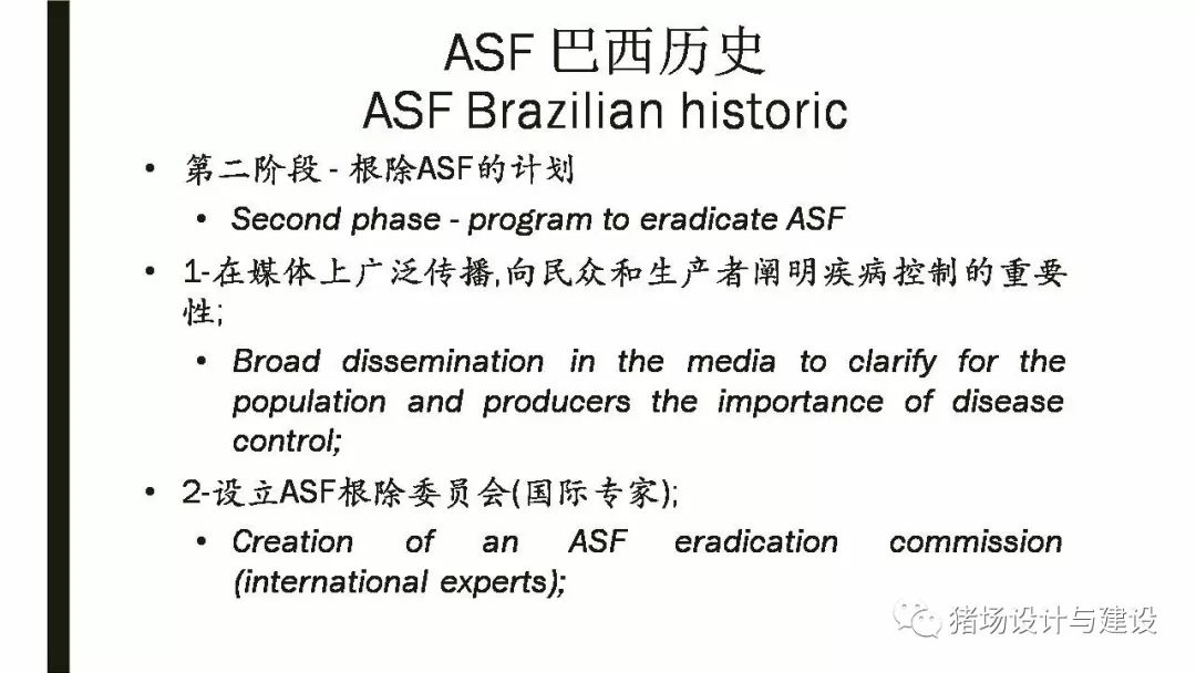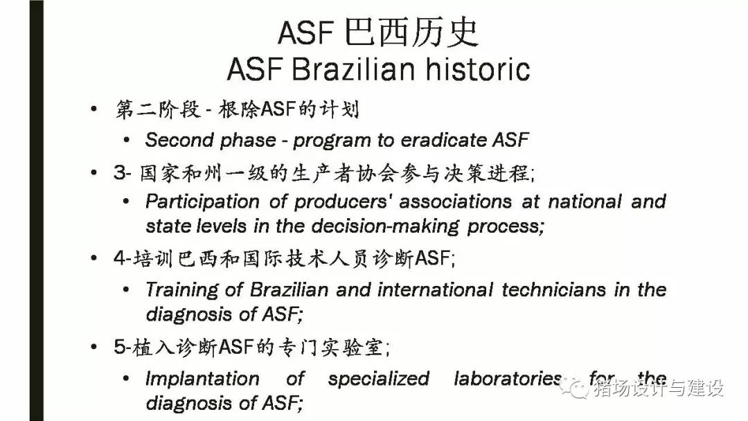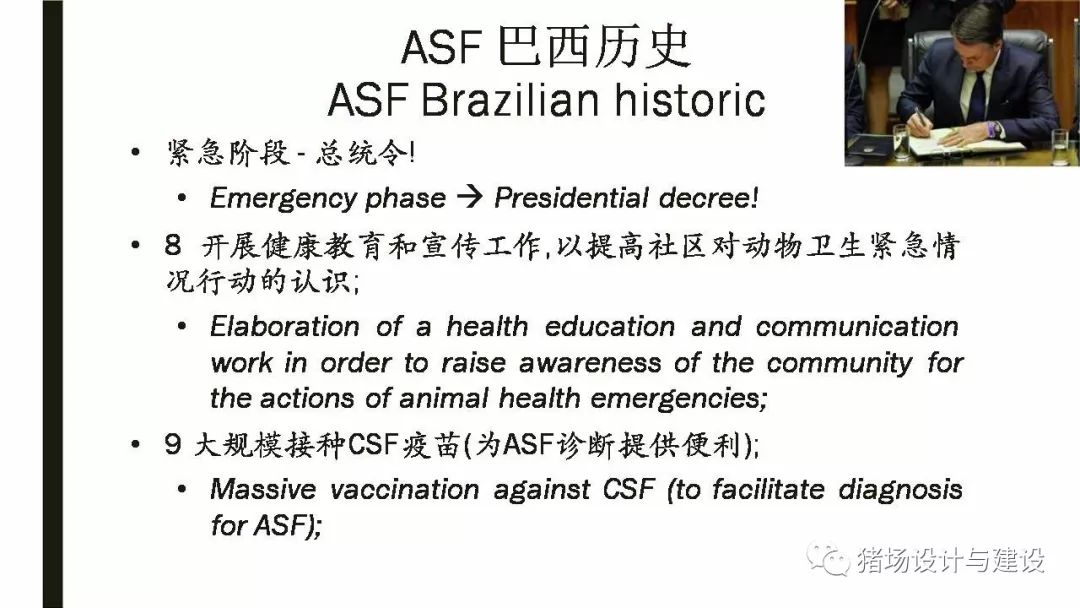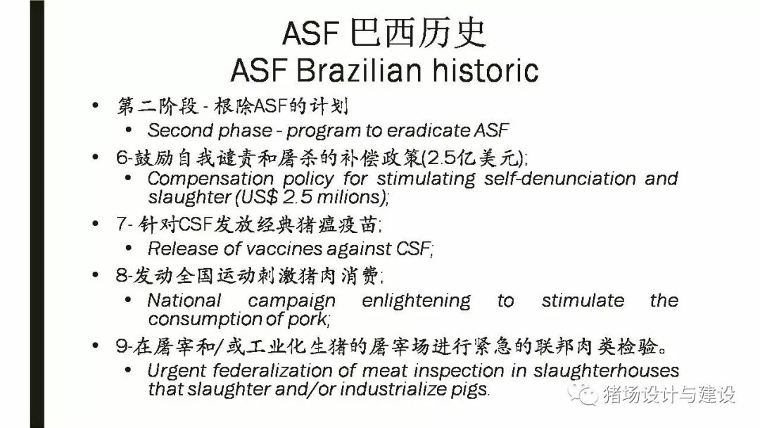 一是立刻将ASF疫情信息通报周边国家,与巴西有双边动物卫生协议的国家,OIE和其他国际组织,特别是FAO,泛美卫生组织,泛美口蹄疫中心和美洲农业合作协会;