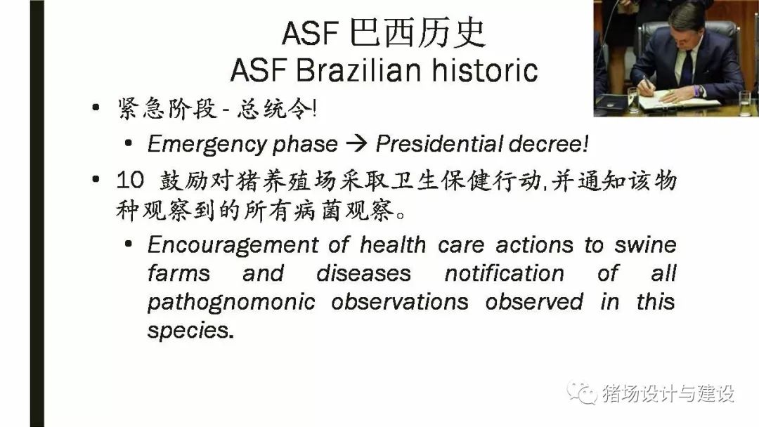 巴西农业、畜牧业和食品供应部(MAPA)在首发病例的实验室确诊之后的15天之内(1978年6月15日)以总统令(总统令81.798)启动了ASF紧急状态。参照OIE陆生动物卫生法典,该联邦立法文件对政府、军队和辅助组织在紧急阶段应采取的措施进行了说明。主要内容如下: