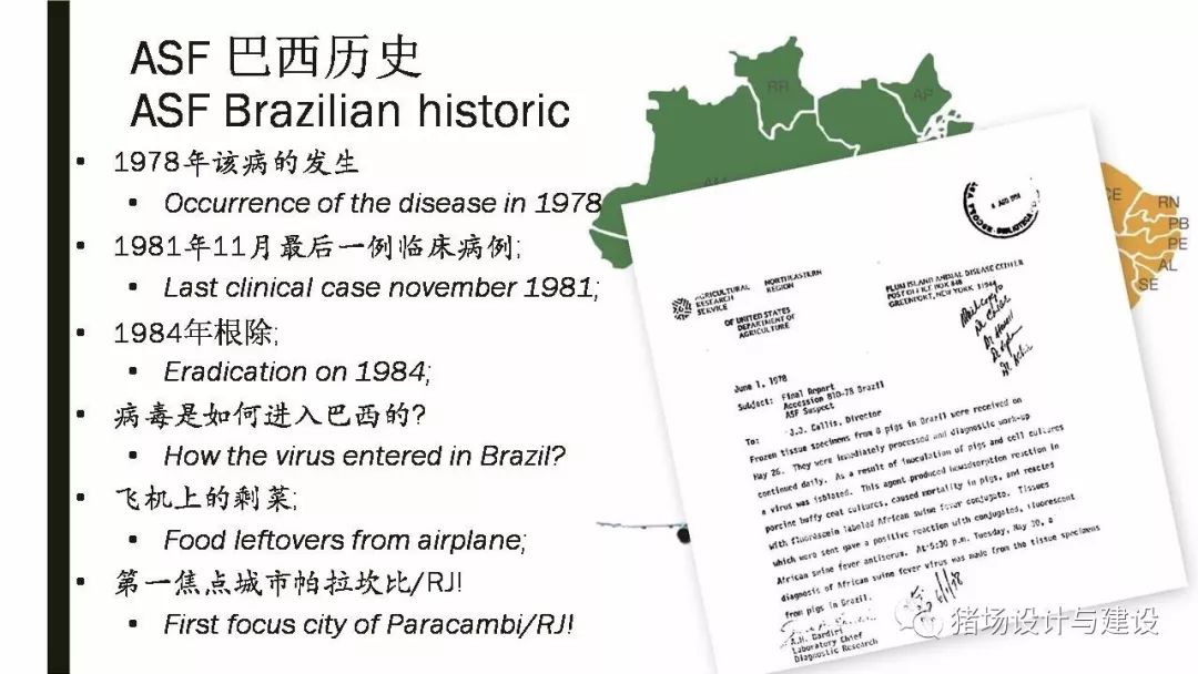 巴西ASF首发病例于1978年5月13日上报到巴西农业、畜牧业和食品供应部(MAPA)。随后的流行病学追溯调查显示,首发病例农场的动物在1978年4月30日即已开始死亡,至1978年5月13日时该农场存栏的1000多只猪已死亡200多只。该农场离巴西里约热内卢国际机场大约52.24公里,养殖者为里约热内卢国际机场内的一名警察。由于工作的便利和机场较差的生物安全管理,该养殖者可以收集国际航班丢弃的残羹来饲喂他饲养的猪只。这些航班中包括来自西班牙和葡萄牙的飞机,而1978年正是西班牙和葡萄牙非洲猪瘟大肆流行的时期。