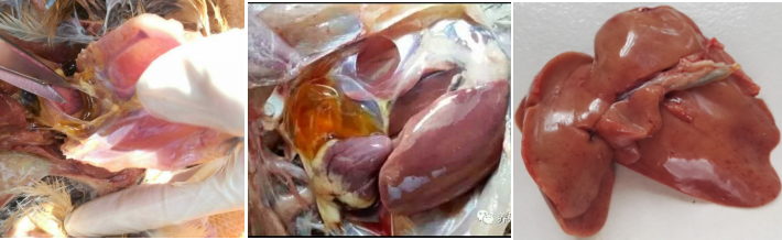 图一/二:心包积液(淡黄色液体或胶冻样渗出);图三:肝脏肿大出血、质脆发黄