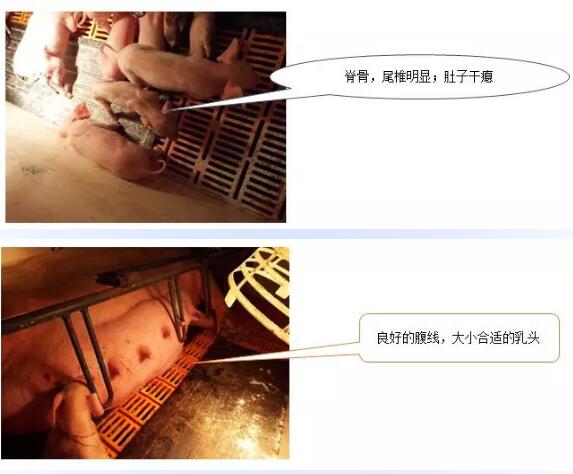 腹部凹陷;脊椎骨可见;被毛不光滑且松散;与同窝仔猪体型不搭;确定落后猪的数量,根据落后猪的数量寻找奶妈猪。