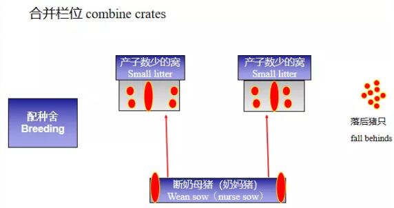 将哺乳仔猪数少的窝合并,合并后不超过奶头数。将这2窝的母猪转到配种舍,再将一头断奶母猪转到其中一个产床给合并后的仔猪哺乳,这样可以空出一个栏位来安置另一头断奶母猪,以便寄养落后猪。