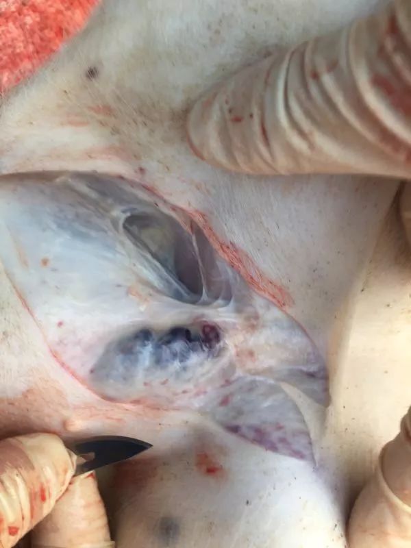 慢性ASF主要病变特征是呼吸道的变化,但是病变很轻或者不明显 (Gómez‐Villamandos等,1995;Mebus等,1983)。病变包括纤维素胸膜炎、胸膜黏连、干酪样肺炎和淋巴网状组织增生。纤维素性心包炎和坏死性皮肤病变也很常见。